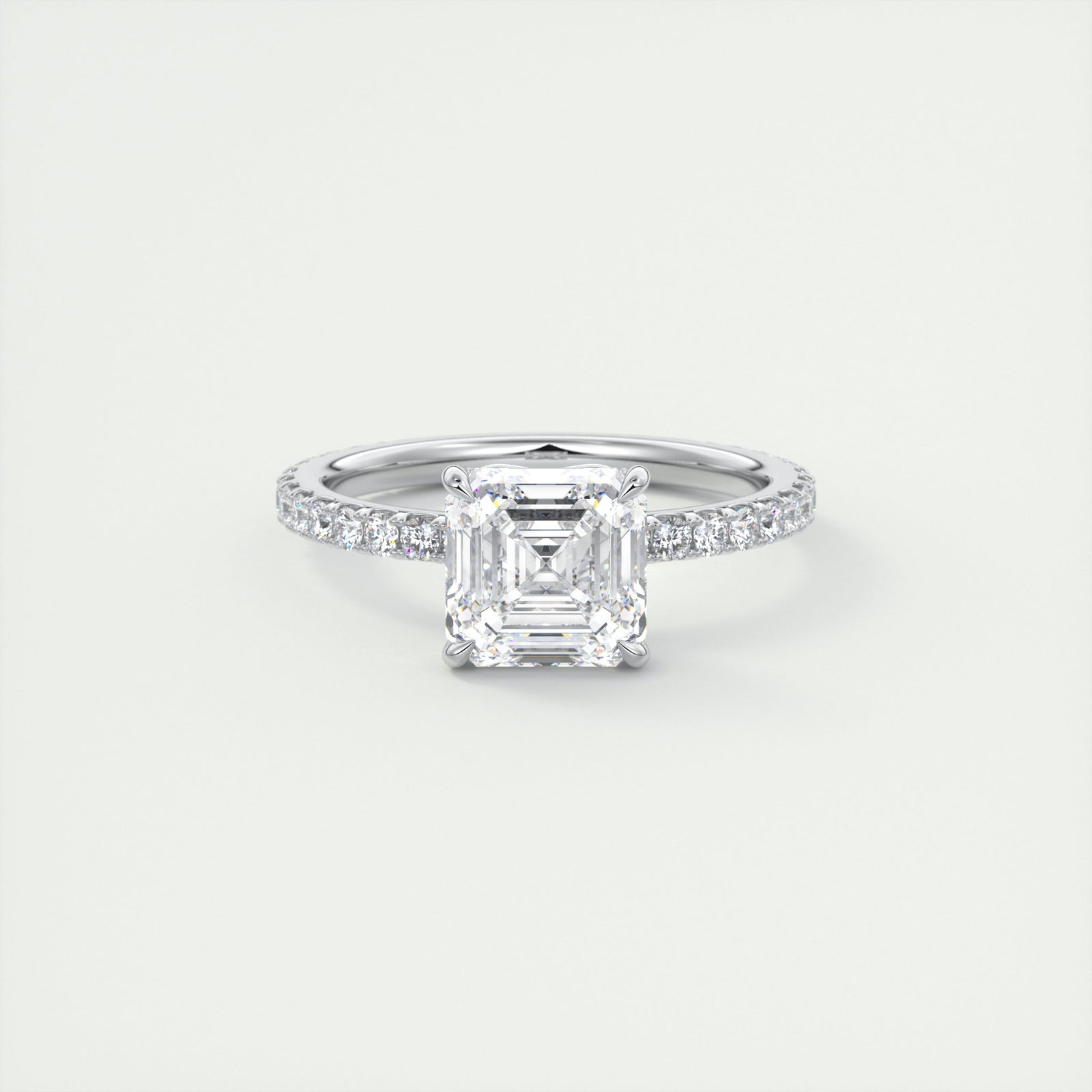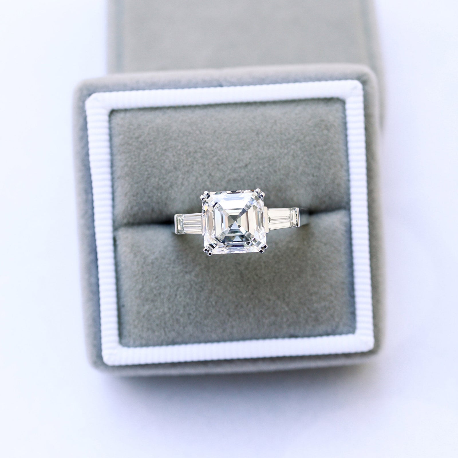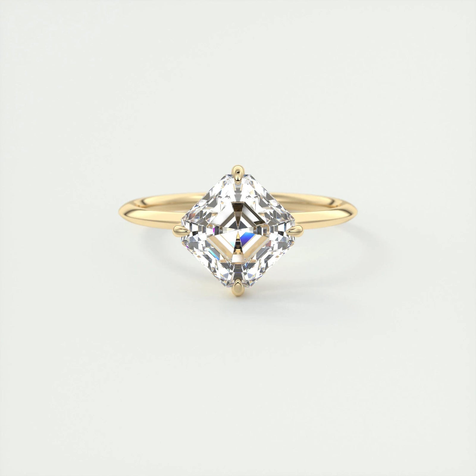 Steeped in Art Deco history, the Asscher Cut is the ultimate choice for the bride who values vintage charm and optical precision. Often described as a "square emerald cut," the Asscher features step-cut facets leading into a deep pavilion, creating a mesmerizing "hall of mirrors" effect. However, unlike the Emerald cut, the Asscher is cut with a higher crown and a smaller table, which produces a distinct "X" pattern (or windmill) in the center of the stone. This unique geometry requires a stone of exceptional quality; because step cuts are unforgiving of inclusions, we use only VVS clarity Moissanite to ensure your ring looks pristine and transparent. While Asscher cuts naturally carry more weight in the bottom of the stone (making them appear slightly smaller than other shapes of the same carat weight), the result is a depth of sparkle that draws the eye inward. Whether set in a sleek bezel to highlight its octagonal shape or held by double claw prongs, these rings are a timeless statement of sophistication.