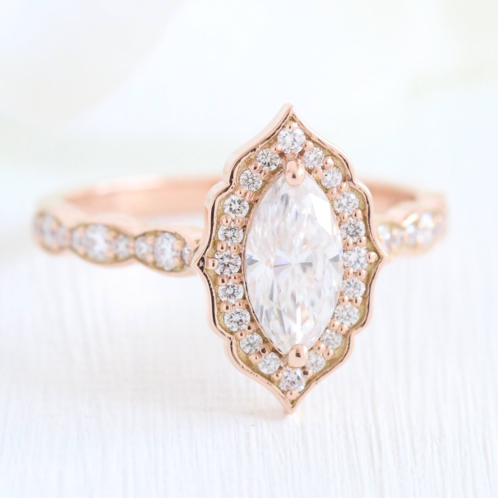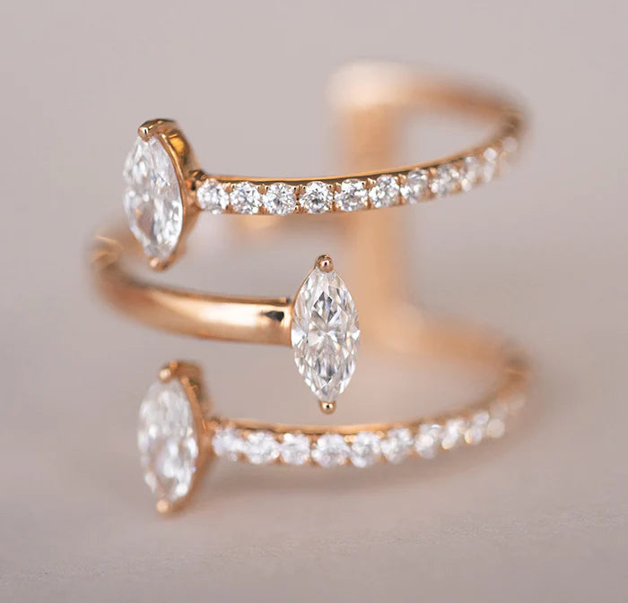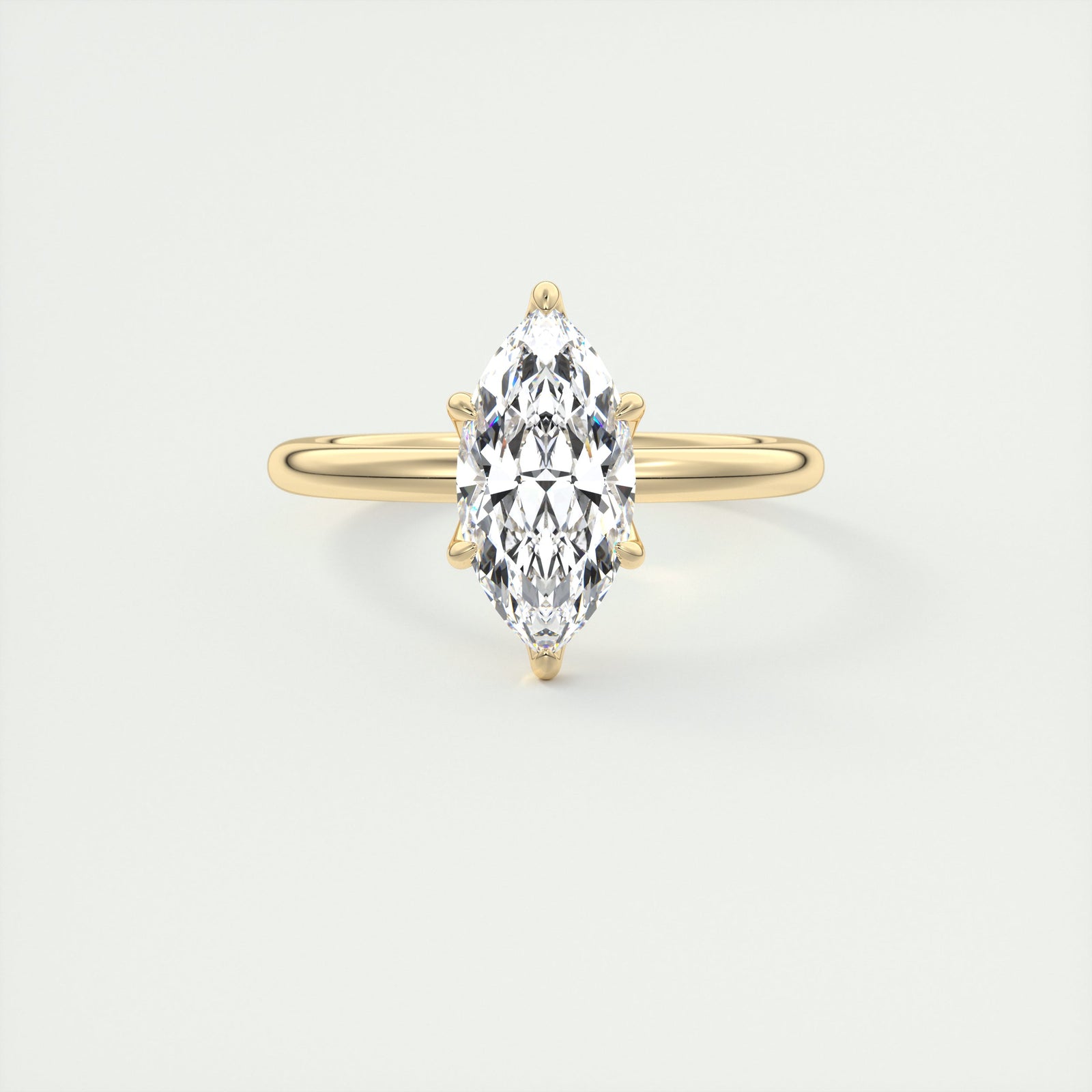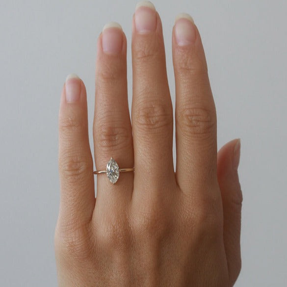 Originally commissioned by King Louis XV to match the smile of his mistress, the Marquise Cut (or "Navette") remains the ultimate choice for those who want their ring to stand out. Boasting the largest surface area of any diamond shape, a marquise moissanite will appear significantly larger than a round stone of the same carat weight, delivering incredible value. Its unique, boat-like silhouette also creates a powerful elongating effect, making fingers appear longer and more slender. However, this shape requires expert cutting to maintain brilliance. We precision-cut our marquise stones to ensure perfect symmetry and minimize the "bow-tie effect" (a dark shadow across the center). Furthermore, because the sharp points of a marquise are vulnerable to snagging, every ring in our collection—from minimalist solitaires to vintage halos—is crafted with secure V-tip prongs (chevron prongs) to fully protect the tips from daily wear. Handcrafted in solid gold and platinum, this is a ring designed for royalty, built for reality.