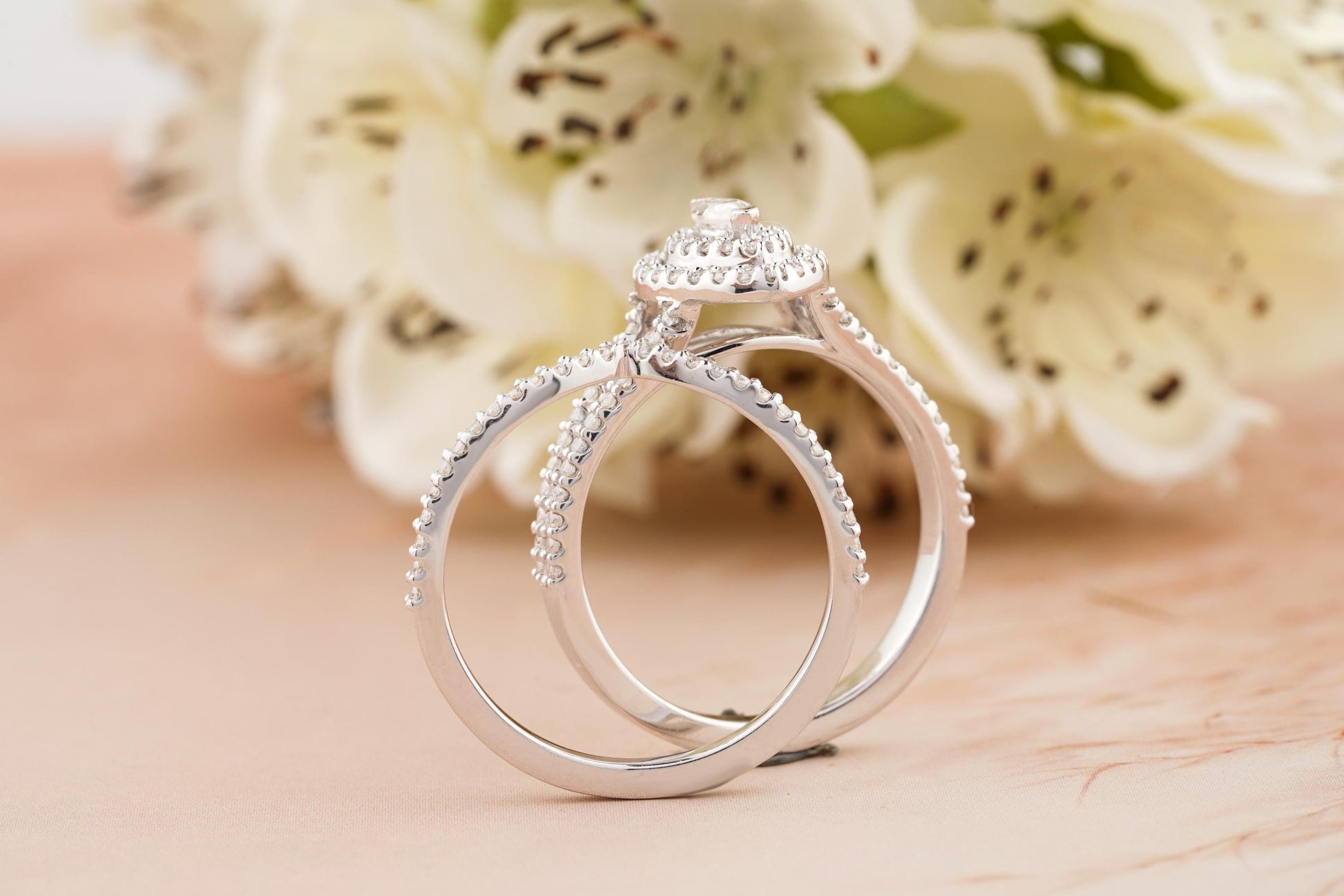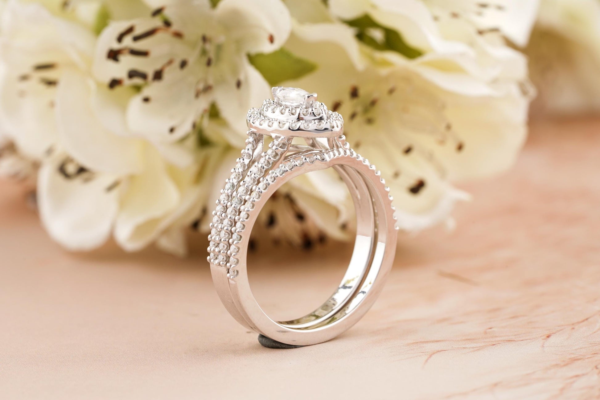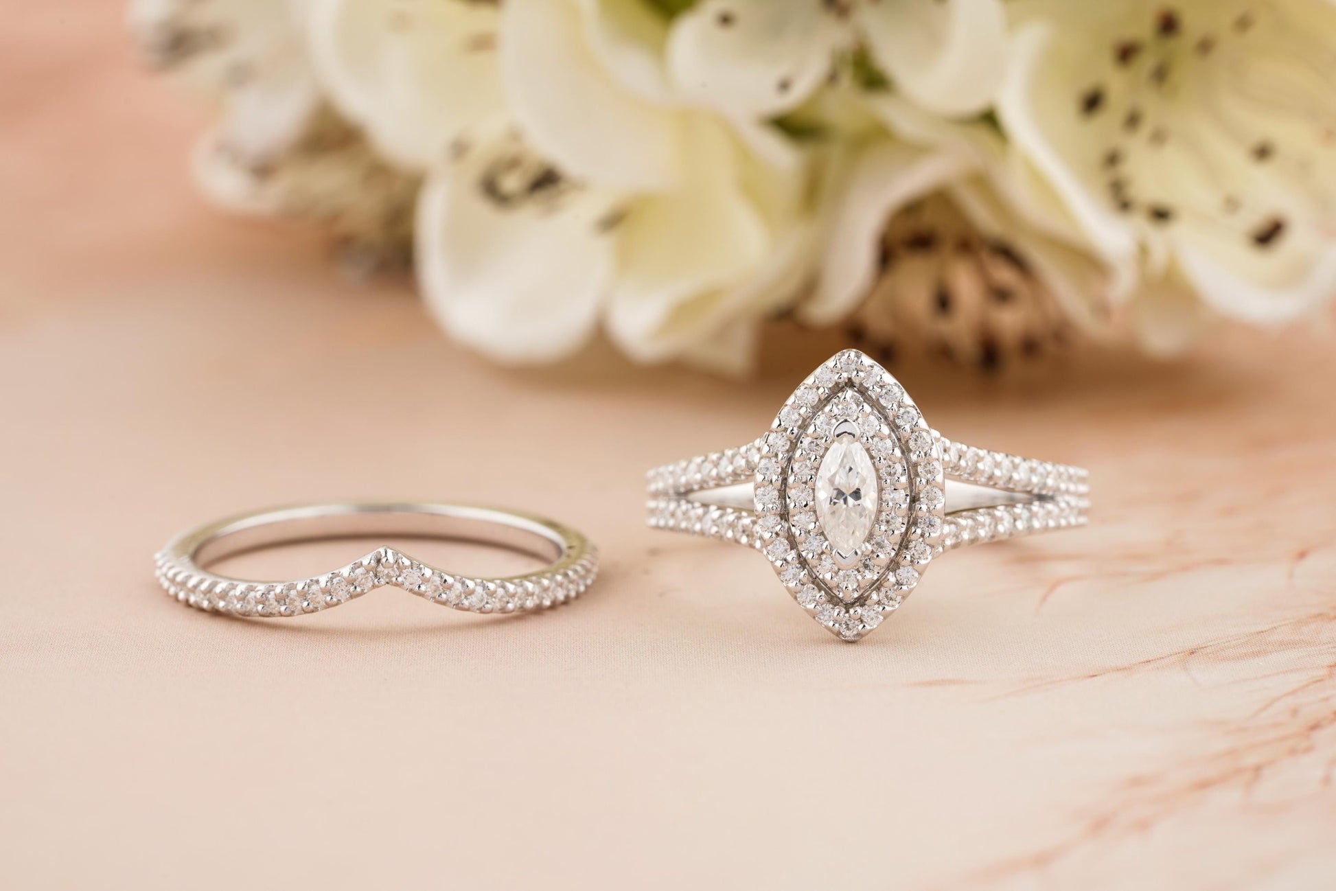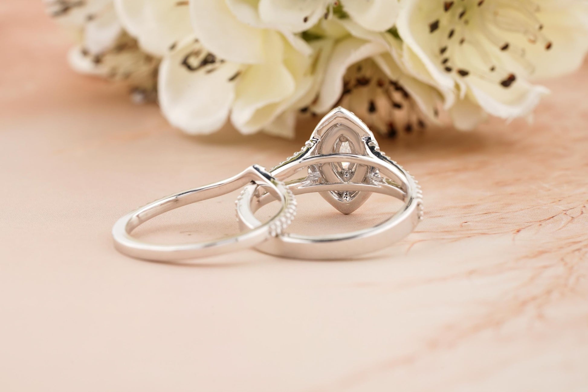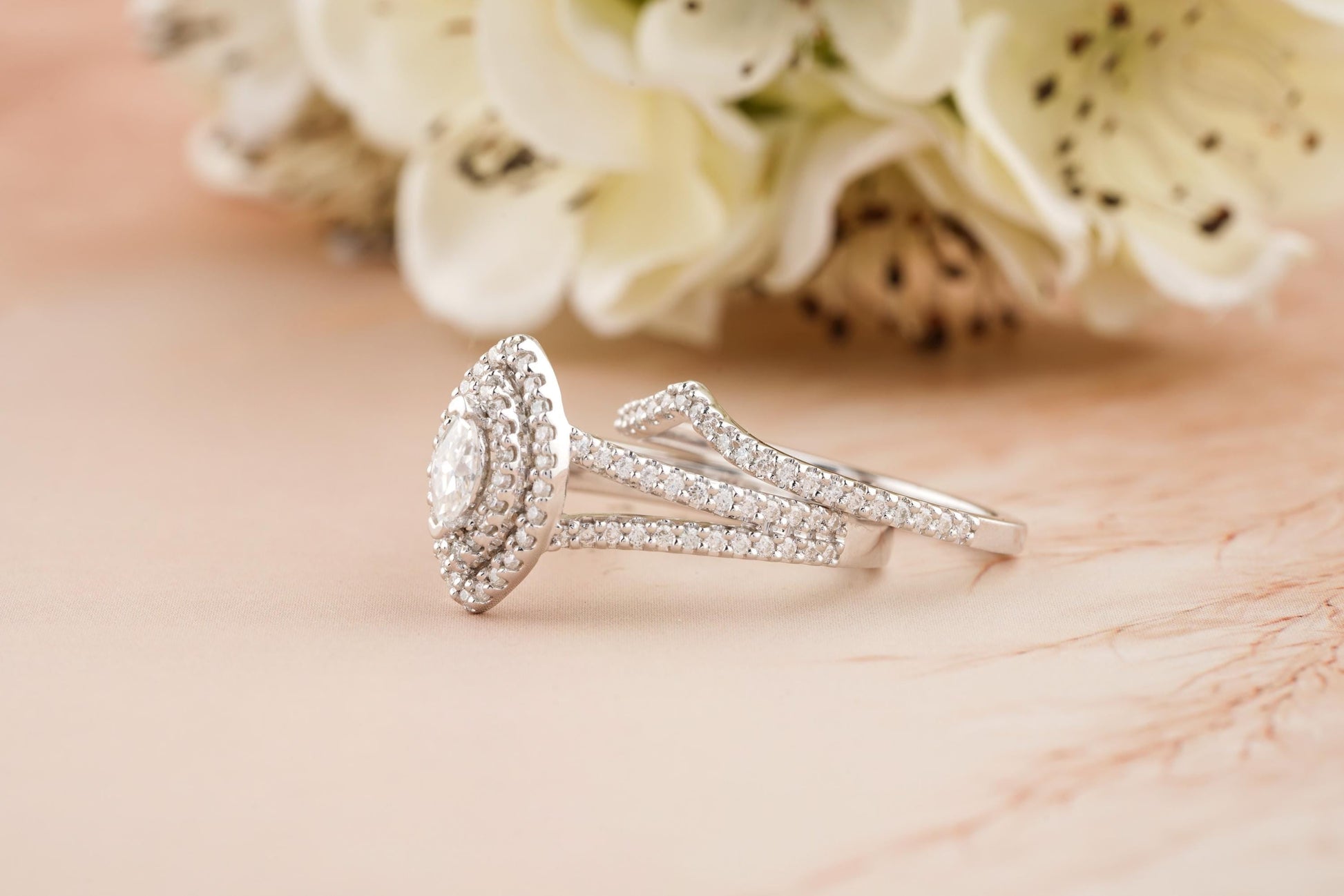 0.50CT Marquise Cut Double Halo F-VS Lab Grown Split Shank Diamond Engagement Ring Set