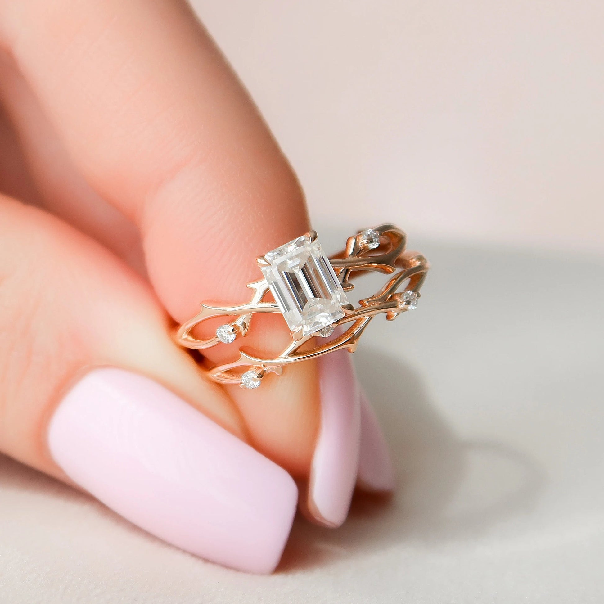 1.0CT Emerald Cut Moissanite Twig Style Bridal Ring Set