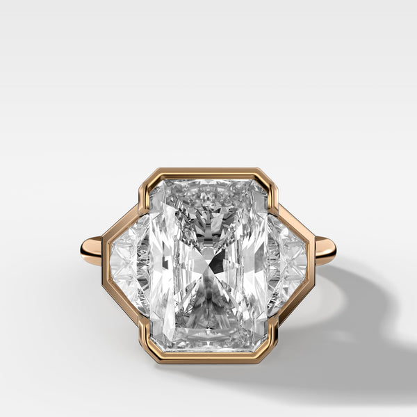 Three Stone Bezel Set Engagement Ring with Trapezoid Side Diamonds and an Elongated Radiant Cut